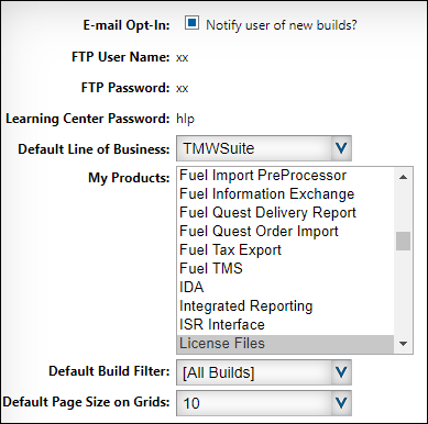 My Products | Displays a list of available products based on the value in the Line of Business field You can press CTL or SHIFT to select multiple products that you download on a regular basis. On the Downloads page, these items are displayed when you select My Products from the Product field. ![]() |