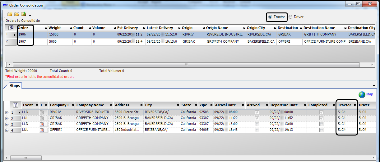 • If all consolidation criteria are met, the system opens the Order Consolidation window. The Tractor radio button is already selected when the window opens.