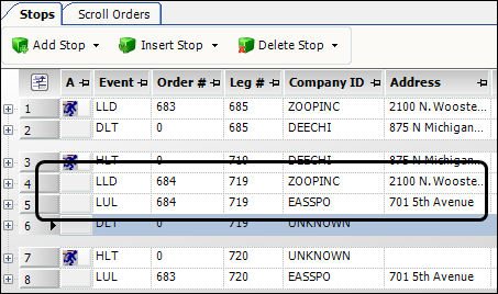 The Stops grid displays the stops from each order in the Orders to Consolidate grid. By default, stops are grouped together by order. However, you can manually re-order the stops. For information on re-ordering the stops, see Resequencing the stops on consolidated orders.