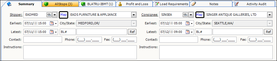 You can map the location of the shipper and consignee by clicking the Map hyperlink on the Shipper or Consignee section of the Summary tab.