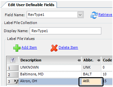 These labels are associated with fields that display drop-down lists of options, such as RevType1, Status or ActgType. For these fields, you can edit: