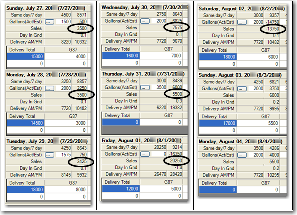The system adds the previous day’s actual gallons on hand and the delivered gallons. It then subtracts the sum from today’s Same day field value to calculate the Gallons Est (estimated gallons) needed today.