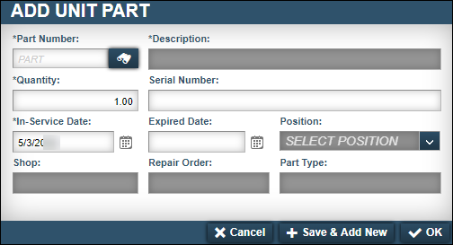 You can add parts to a unit’s record for tracking purposes. Before you add the part to a unit record, verify that the part exists in your system.