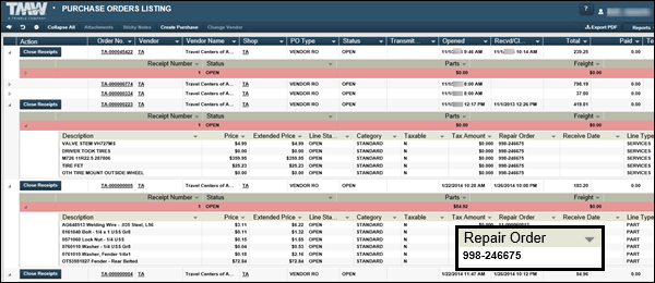 If a line item on the PO is associated with an RO, the RO number is listed in the Repair Order column.