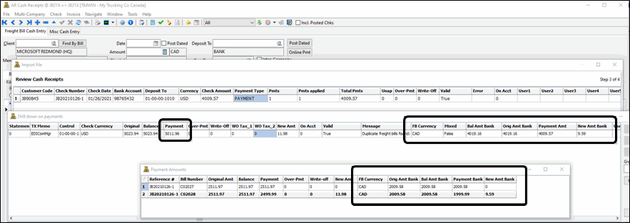If it is a cash receipt that is being matched to freight bills by the 'Reference on AR Record' (ie. a Trace number on the bill), you will see the individual bills with the AR converted to the cheque’s currency on the right.