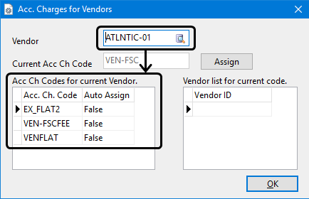 The Acc. Charge for Vendors window will appear and display all the Vendors currently associated with this accessorial charge in the list on the right.