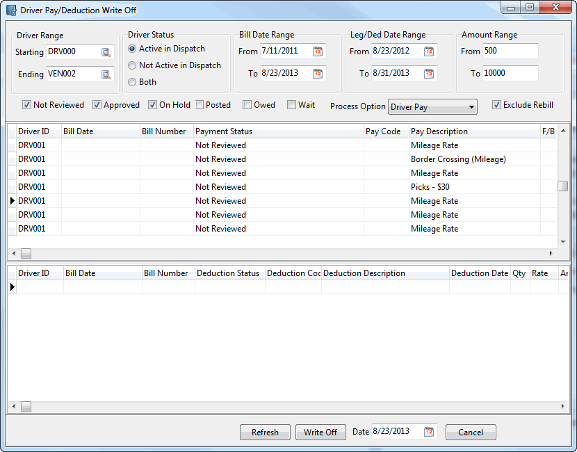 This window consists of three sections. The upper section is where you define your filtering options. The middle grid is where the details of your driver pay filter results are displayed (when you have Driver Pay selected as your Process Option), and the last section is where the details of your driver deduction filter results are displayed (when you have Driver Deduction selected as your Process Option). If you select 'Both' for your Process Option field, both grids may contain records (depending on your filtering options).