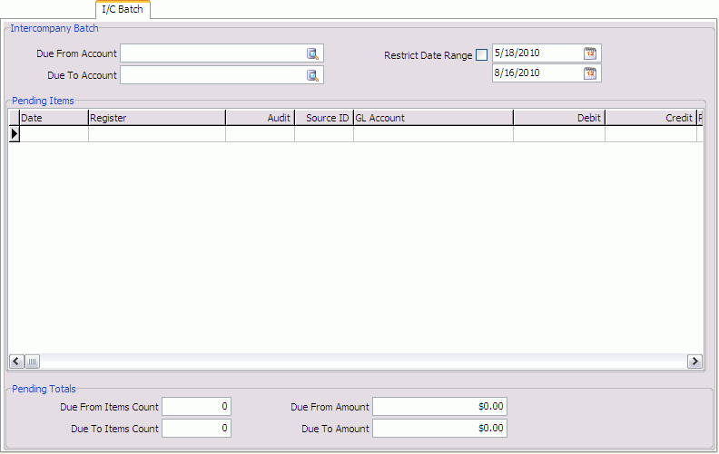 This Open tab process is totally manual and, despite the options to highlight many rows at once, can be tedious and time-consuming if you have a large volume of transactions. As an alternative, you can use the I/C Batch Tab. Entries here can be filtered by Due From Account, Due To Account, and Date Range.