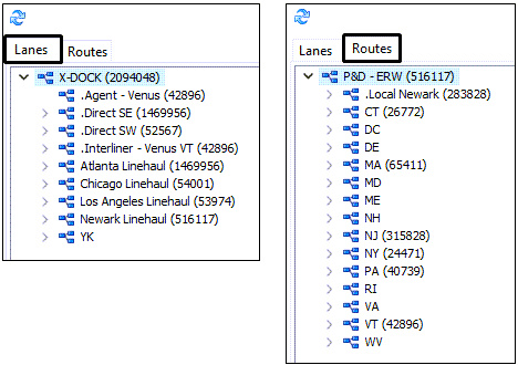 This section is built around the concept of grouping delivery zones into a lane. In visual terms, imagine parking all the trailers to be loaded with freight bound for a specific region or destination in one lane in the yard. In this way, the lane tree represents all of the zones serviced through your terminal. For more information on lanes, including setup details, refer to How do I Setup and Use Traffic Lanes? In Dispatch > CrossDock > How Do I?