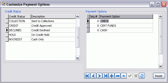 Selecting the Reset button will remove any Custom Payment Options the User has added to the Payment Options Grid.