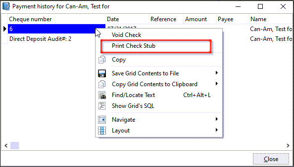 In the Payment History window, a new Print Check Stub shortcut menu option lets you reprint a posted driver paycheck.
