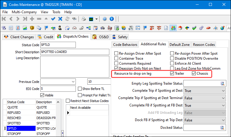 If yes, TruckMate creates a new trip containing the trailer and the load items. The trip has a spotted status. If the trailer had a seal number on the original trip, TruckMate passes the seal number to the new spotted trip.