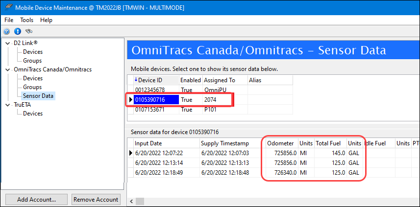 Since the Omnitracs workflow uses a U.S. setting, the Odometer Units are auto-set to miles and Total Fuel Units are set to Gallons. Mobile Device Maintenance users can view the sensor data for a particular device. Fuel data sent to TruckMate will be seen inside of the Activity log.