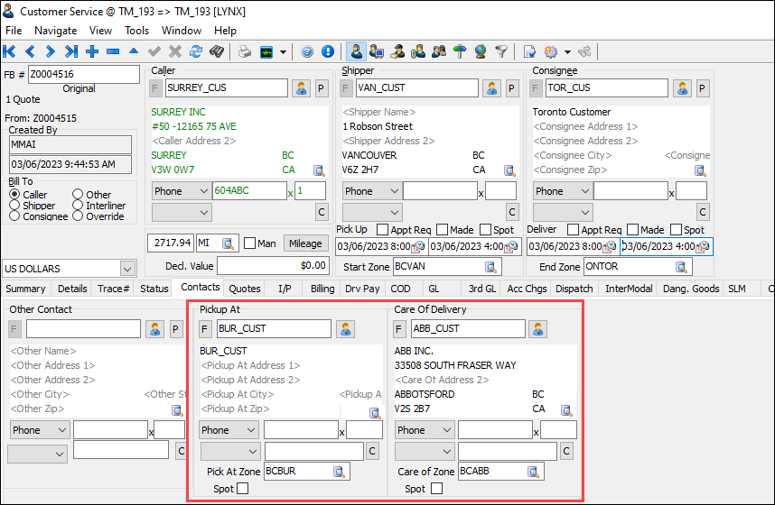 In this example, the freight bill Z0004516 has these contacts specified.