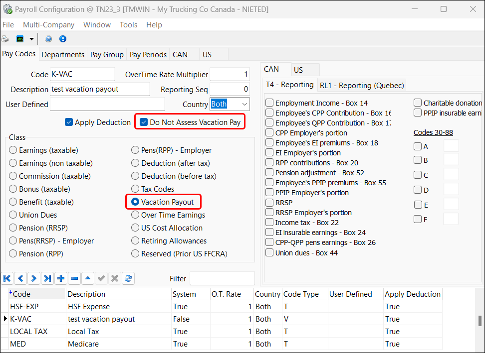 A non-system Vacation Payout code had its Do Not Assess Vacation Pay checkbox either checked or cleared.