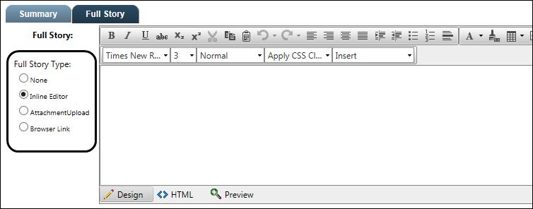Note: Because of a function of Windows, the page will refresh after you select the full-story type (Step 4) and the contents of the News Image field will be cleared. You may want to complete this field after you select the Full Story Type.