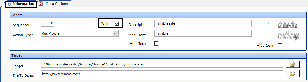 By default, the File to Open field lists parameters to add to the command line in the sequence they appear in the Menu Options tab. If this checkbox is selected, you will need to add any parameters to the File to Open field manually. |