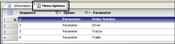 The Menu Options tab is a grid used for creating, editing, sequencing, or deleting parameters that are passed by the custom command to the target application.