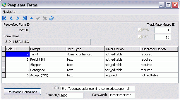 The two TruckMate Macro ID fields specify which TruckMate Macro will be associated with the PeopleNet forms. Once you have downloaded the definitions (see below) enter the macro number you wish to associate with the forms in the text field provided. The 'FWD' and 'RET' checkboxes will default to selected depending on if the selected Peoptton and define which Macro slot you wish to use. Make reference of the numbers chosen here.