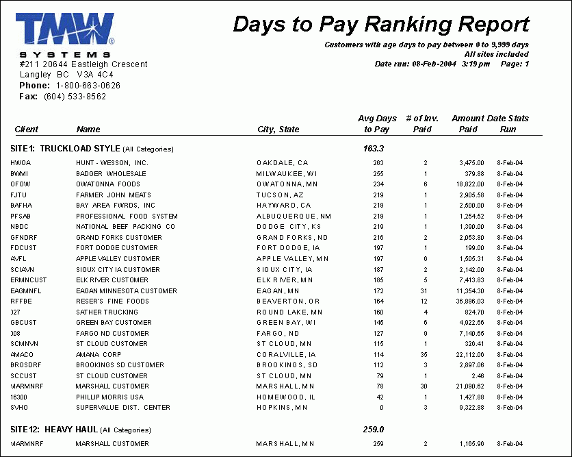 Produces a list of Clients, in order of their 'Days to Pay' values, from 'Worst' to 'Best'. You have the ability to select only Clients with 'Days to Pay' in the range of Lowest to Highest.