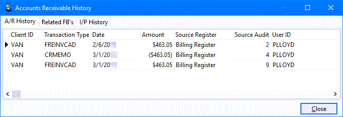 If the invoice status is Original, Credit, Rebill, Inter Comp Credit, or Inter Comp Rebill, clicking the text displays the Accounts Receivable History window. You can also access this window by going to Tools > More FB Info.