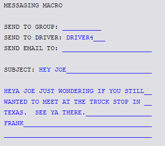 It is also important to note that drivers should be informed that all information transmitted via a macro is 100% visible to anyone using the Message Center or Driver Call In program. There is no privacy in regards to e-mail content.