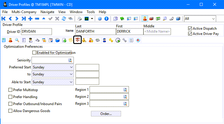 Indicates whether the Driver is available for assignment in the Dispatch and Local Dispatch programs, and thus available for assignment to trips or Freight Bills. If a Driver is ill or on holidays or has been terminated, clear this checkbox to prevent them from being accidentally assigned to a trip or Freight Bill. |