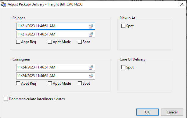 Previously, the Adjust/Pickup Delivery window in Dispatch and Multi Mode Dispatch let you update pickup and delivery times and any appointment-based fields. However, you could not update spot fields.