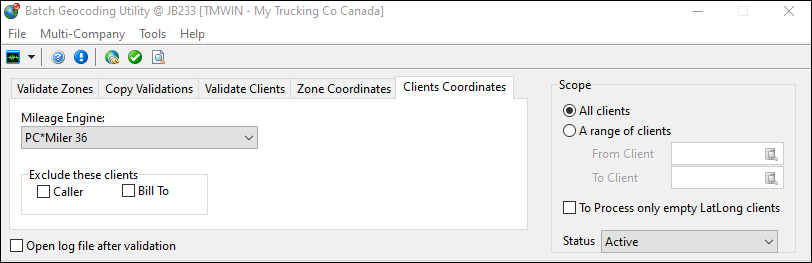 With address synchronization enabled, you can perform a batch address validation for some or all customers in your database. TruckMate makes a REST call to sync the client address data with the Places API data. Errors are recorded in C:\Program Data\TruckMate\valutil.log.