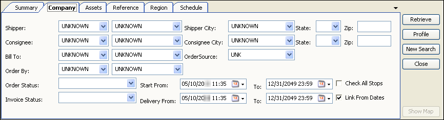 Ship date range Delivery date range When you modify the dates on the Company tab, the system also changes the dates on the Assets and Schedule tabs. You can use the By default, the system uses the date that is 30 days prior to the current system date as the beginning of the Start From and Delivery From date ranges. However, you can change this in your TTS50. Use the |