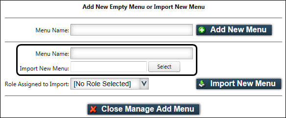 To select a different menu to import, next to the file name in the Import New Menu field, click Remove. Then click Select to select a different menu. Then click Import New Menu.