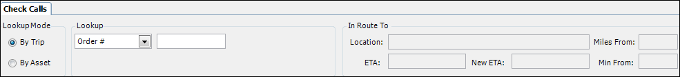 You have the option of searching check calls by trip (order number) or by asset (driver, tractor, trailer, or carrier). You use the [Dispatch]CheckCallMode setting in your TTS50 to determine which option is selected by default.