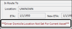 You set a driver’s domicile, or home location, in the Check Calls window. You can quickly tell whether or not a driver’s home location has been set. If it has not been set, the system displays a message under the In Route To pane.