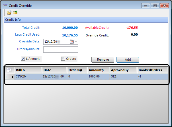 Note: You can view a history of credit overrides issued to the Bill To in this grid.