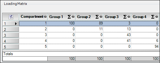 In the Loading Matrix grid’s Group 1-5 columns, enter the percentage of each axle group’s weight capacity that is dedicated to supporting each compartment.