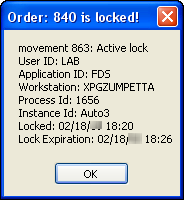 This order and all orders on the same movement are locked to the current user/workstation. This lock is released when the user saves the order, or the lock is allowed to expire. |