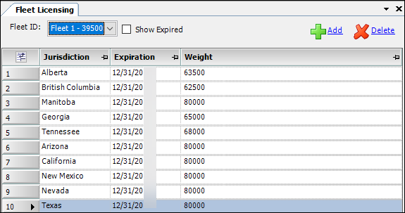 Add each associated jurisdiction, its license expiration date, and corresponding GVW.