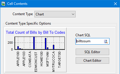 This type of cell content allows you to use pictures stored in the database to be displayed in the cell. In addition to the re-size options available for loading pictures from an image file, a SQL entry is needed to fetch the picture from the database. You can either select a pre-defined SQL statement or use the SQL editor button to define your own SQL statement.