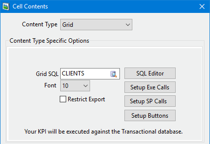 The Restrict Export checkbox on the Cell Contents form for Grids controls whether users can export the data displayed within the grid to an external file. When the checkbox is cleared, the Save Grid Contents to File right-click shortcut menu item is enabled for that cell.