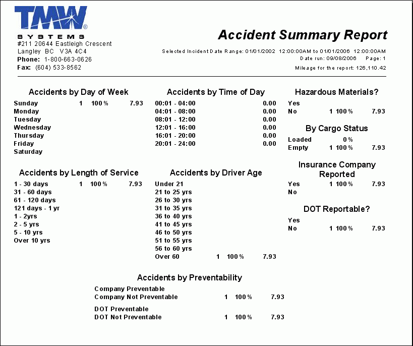 This report is used in conjunction with the Safety & Compliance program (SAFETY.EXE), and will list a summary of all recorded Accident information.