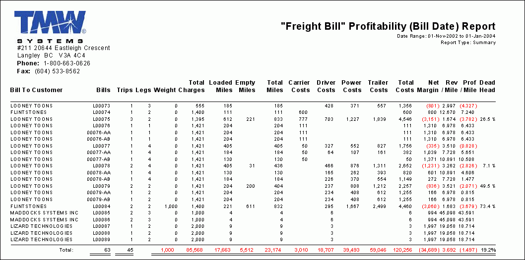 The Summary Report lists the 'Trip #', 'Trip Date', 'Trip Legs', 'Bills', Weight' information, followed by a host of different 'Cost' values (Power Unit, Driver, Trailer, etc.). A 'Total' of costs is given, as well as a 'Net Margin' value, 'Revenue/mile' and 'Profitability/Mile' and 'Dead Head' values.