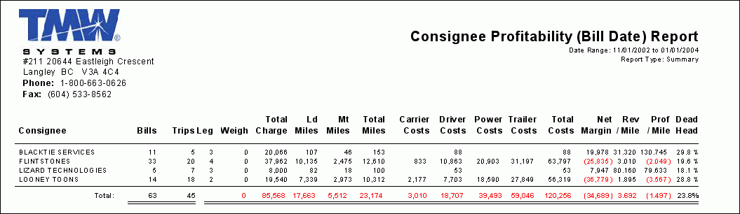 The report will display the 'Consignee' Code with the most Freight Bills first, followed in order by the other 'Bill-To' codes in the system. The report also displays the 'Trips', 'Loaded Miles', 'Total Revenue' percentage, 'Carrier Costs', 'Power/Driver/Trailer Costs', and the 'Net Margin' and 'Revenue per Loaded Miles values.