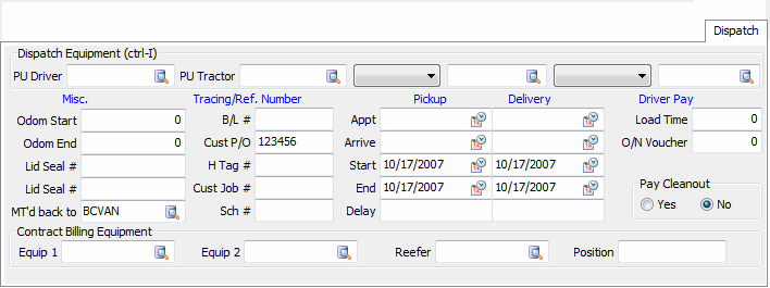 The Dispatch Tab offers mainly summary information from the Dispatch program about the Freight Bill. There are some fields that can be set that will affect driver pay and contract billing.