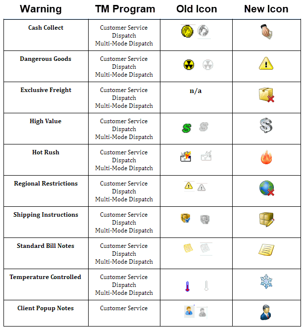 As part of a larger ongoing project, a major update was done to the Warnings structure in TruckMate to refresh the appearance of the warning icons and eliminate unnecessary 'grey' icons telling you when there was no warning.