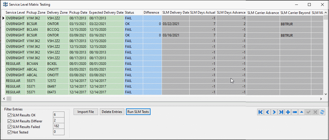 The testing records in the main grid can be imported or manually entered. If imported, the import file should include the service level, start end, end zone, pickup date, and expected delivery date provided, as shown in this example: