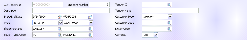 Enter the shop at which the work is being performed. Double click or click the search button for a list of valid shop codes. In the next field, click the search button for a list of available Mechanics at the currently selected Shop.