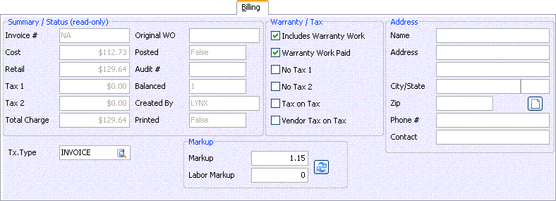The Billing tab controls all of the charges that will be updated into your General Ledger for your Work Orders.