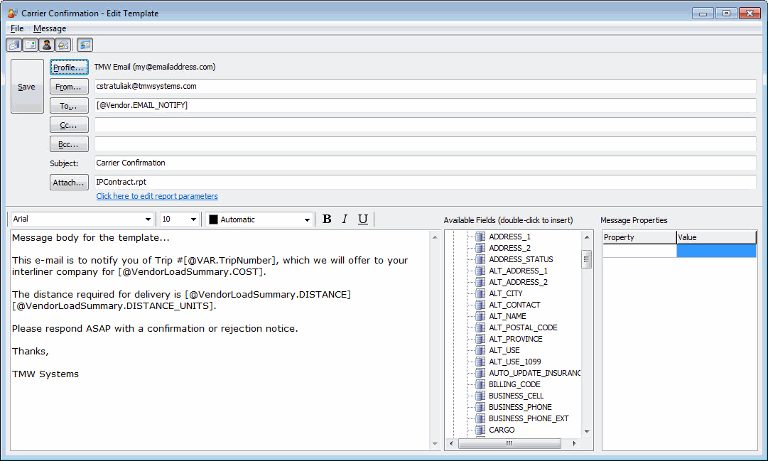 The Available Fields section is a powerful tool that allows you to setup very detailed dynamic e-mail messages that will pull information from the TruckMate database that relates to your e-mail message. The Available Fields section lists the TruckMate database tables and fields relevant to the e-mail task you are working on. For example: