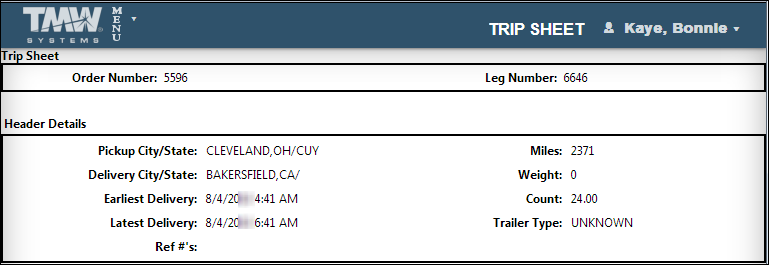 The trip sheet opens in a separate window. This illustration shows how a trip sheet might look.