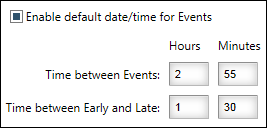 In this example, when the Enable default date/time for Events checkbox is selected, the entries in the Hours and Minutes fields are applied.